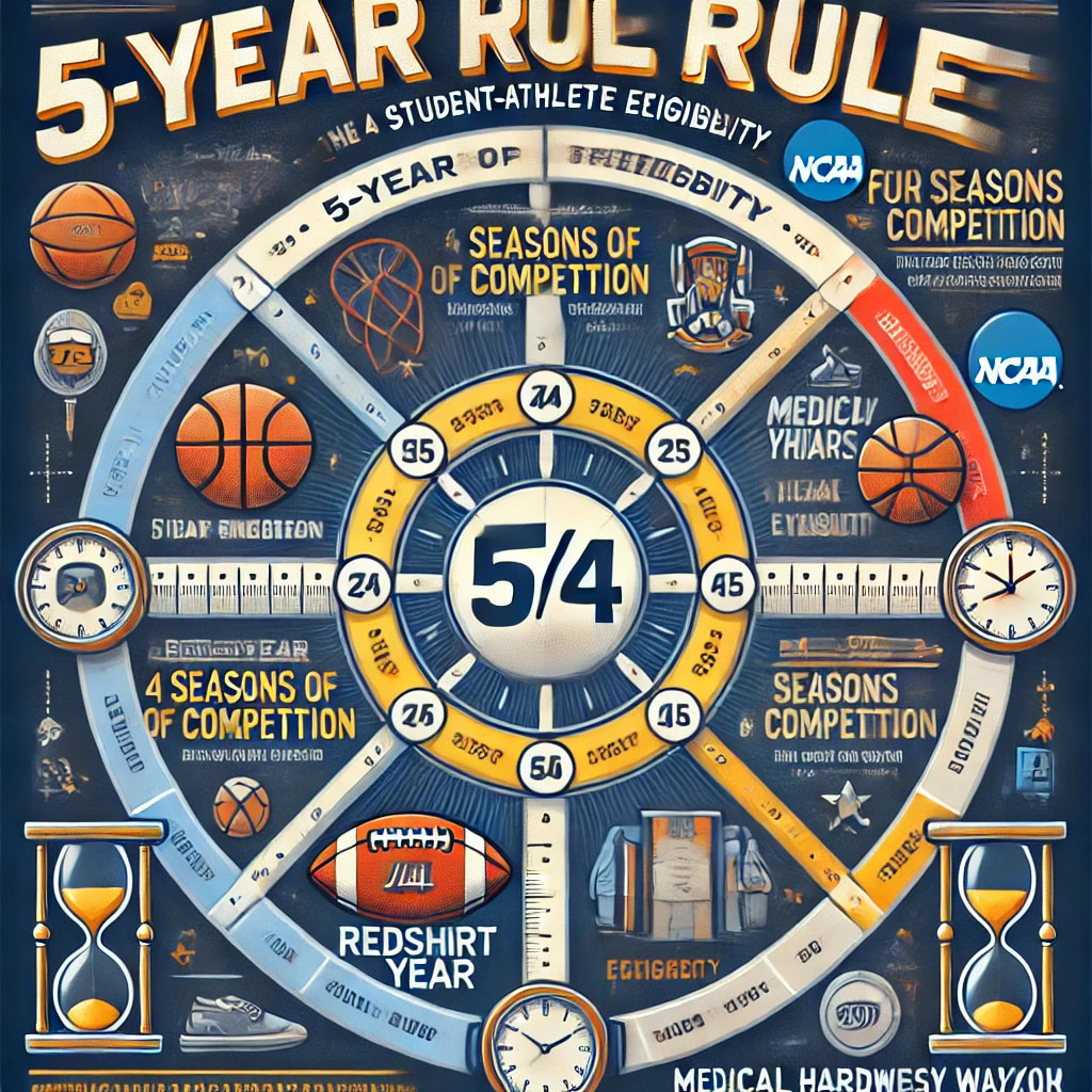 – 5 Years to Play 4 Seasons: The athlete has five calendar years from the time they first enroll in college to complete four seasons of competition. This is the core of the rule.